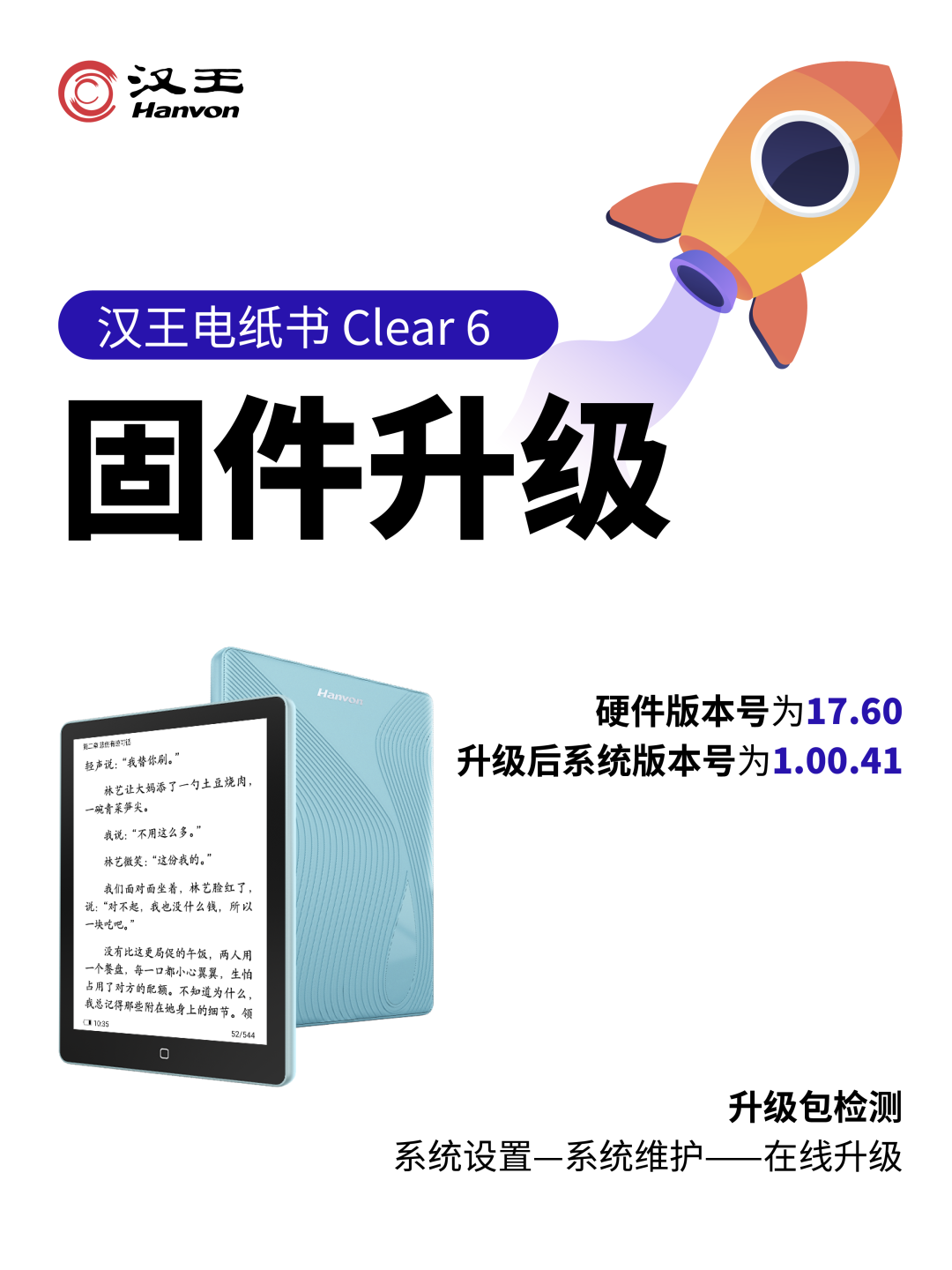 汉王 Clear 6 电纸书于今年 2 月 26 日上线, 搭载 4 核 1.8Ghz 处理器,内置 3000 毫安时电池;配备 6 英寸 1024x758 分辨率黑白墨水屏;支持 Regal 残影消除技术,“软件级”256 灰阶显示效;,装配 30 级 DC 调光的冷暖阅读灯。