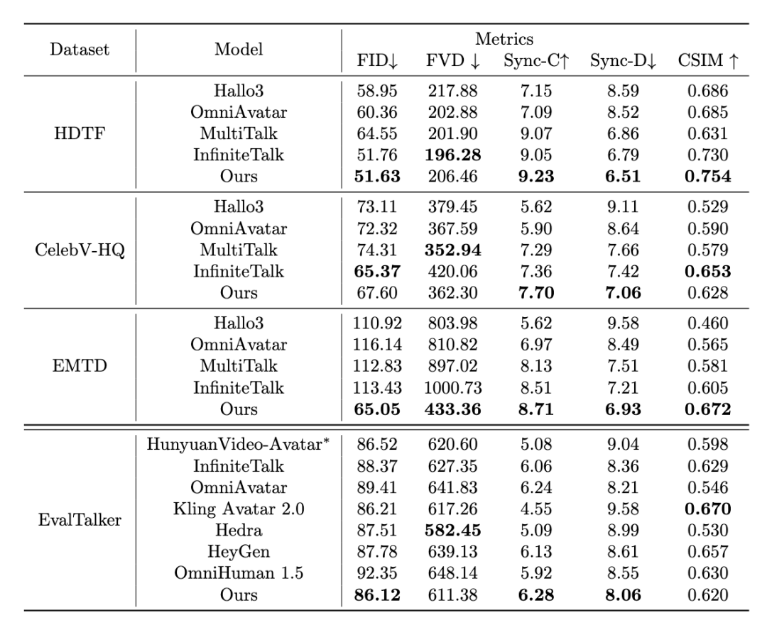 据官方介绍,该模型具备如下技术亮点。 “告别僵硬,迎接鲜活”:不仅能指挥嘴型,还能同步指挥眼神、表情和肢体动作,实现丰富饱满的情感表达。 连“不说话”的时候,都很像人:美团通过 Disentangled Unconditional Guidance(解耦无条件引导)训练方法,让模型明白了“静音”不等于“死机”。在说话的间歇,虚拟人也会如同人类一般自然地眨眼、调整坐姿、放松肩膀。 据介绍,LongCat-Video-Avatar 因此成为首个同时支持文字、图片、视频三种生成模式的“全能选手”,虚拟人从此有了“真正的生命力”。 在 HDTF、CelebV-HQ 、EMTD 和 EvalTalker 等权威公开数据集上的定量评测表明,LongCat-Video-Avatar 在多项核心指标上达到 SOTA 领先水平。